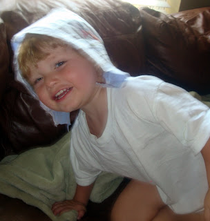 Then, he thinks it is hilarious to wear it as a bonnet. Cute because he looks like a pilgrim, not so cute when the diaper is dirty.